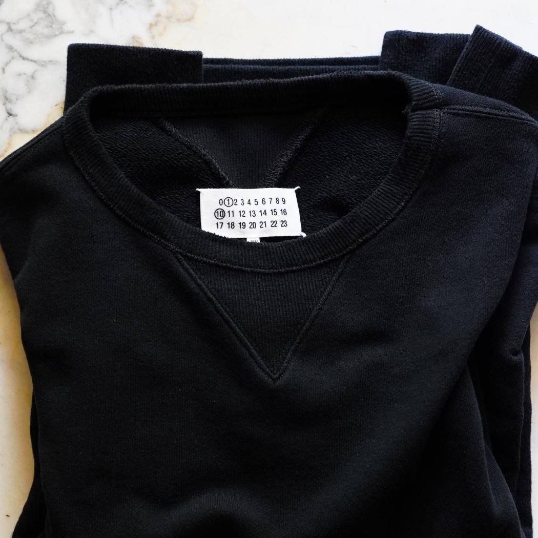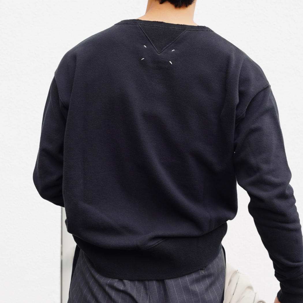 背面にはメゾン マルジェラのアイコンである4本の白いステッチが施され、ラベルの代わりにブランドの存在感を際立たせます。
