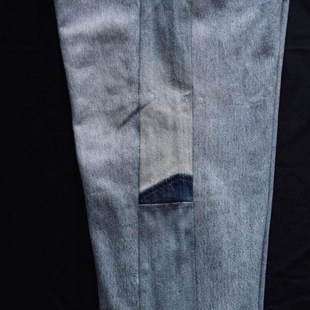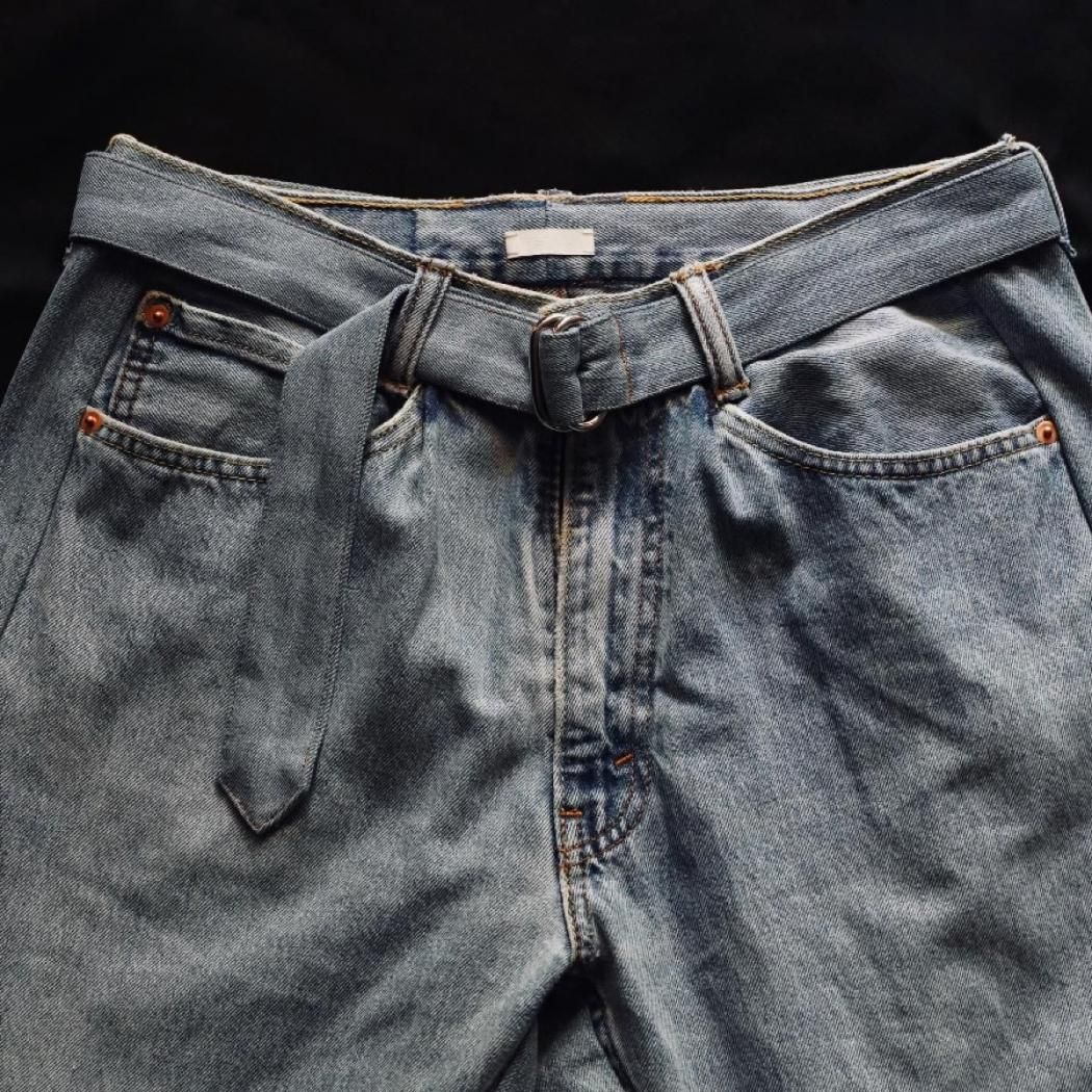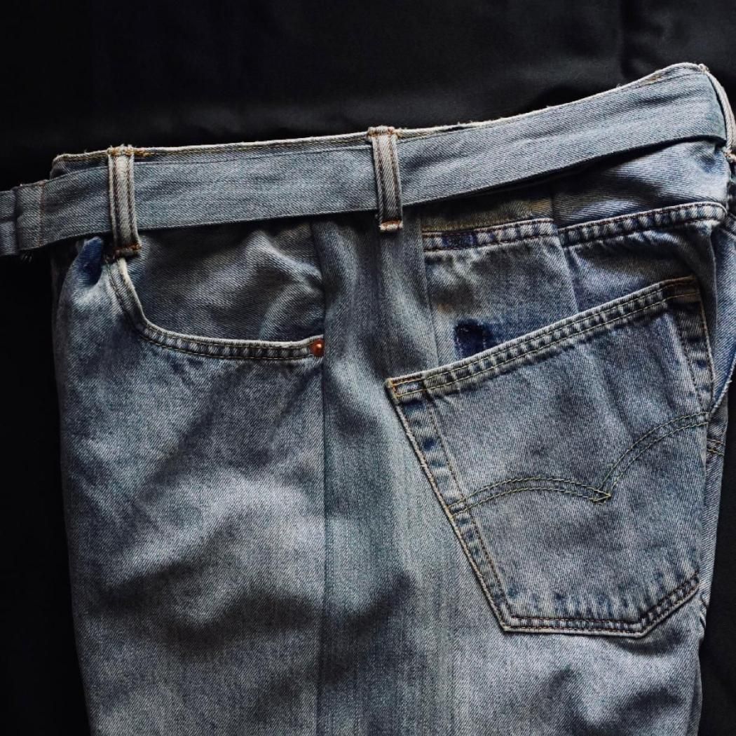vintage生地の風合いはそのままに、古着には無いワイドテーパードシルエットに再構築しています。