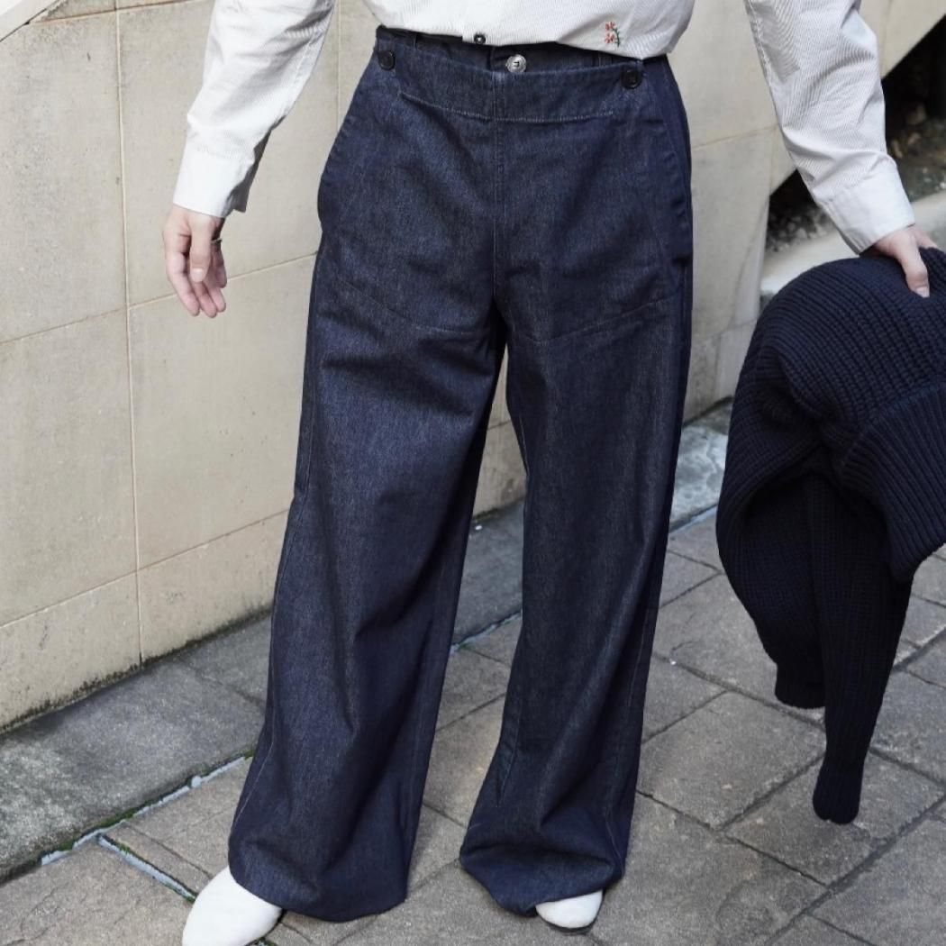 セーラーパンツをデニムを使用し現代的に再構築しています。