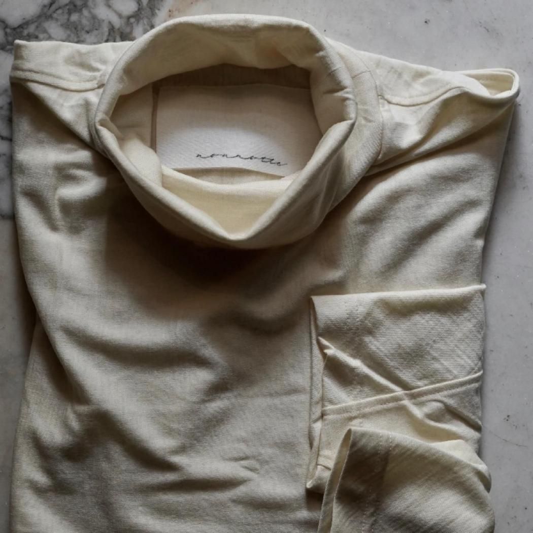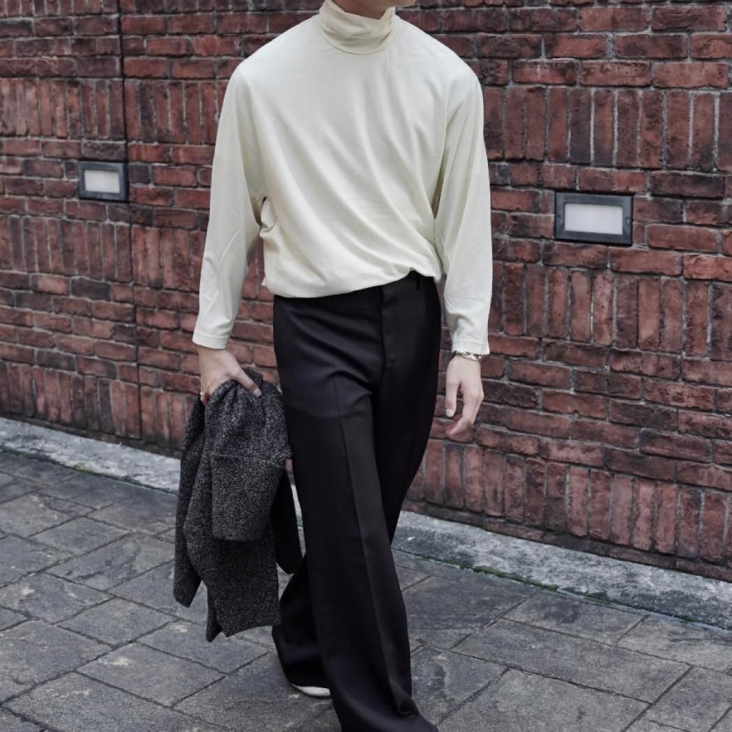 super140の極細ウールを使用したウォッシャブル天竺製ハイネックプルオーバー。